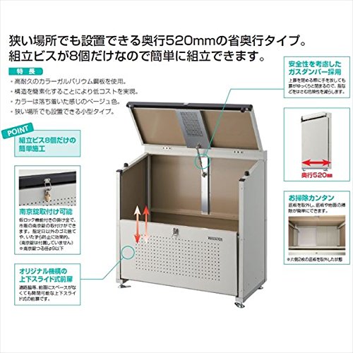 ●高耐久性のカラーガルバニウム鋼板を採用したゴミ収集庫です。構造を簡素化することで低コストを実現しています。カラーは落ち着いた感じのベージュタイプで、どんな設置場所でも対応します。狭い場所でも設置できる小型タイプです