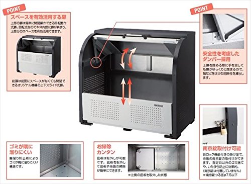 ●組み立てが簡単です。● 高耐食溶融めっき鋼板(ZAM?)に塗装仕上げです。塗装色はオータムグレーです。● 前扉が前倒し式なのでゴミの搬出が容易です。また、積雪時でも開閉可能です。● 上部折戸は風にあおられにくい構造です。● 世帯数の少ない集合住宅や店舗などに最適です。