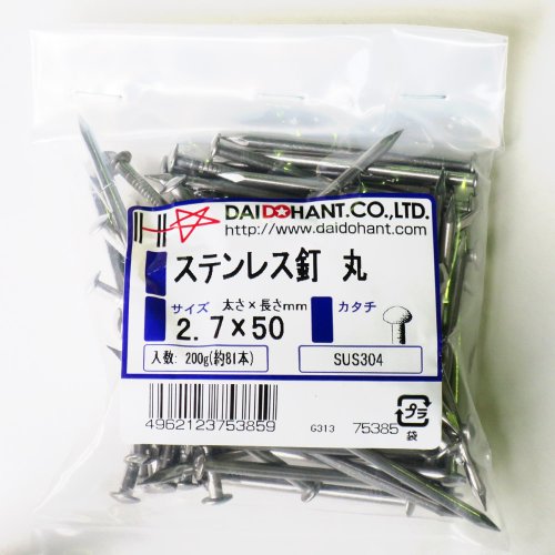 ステンレス釘 丸 2.7x50 200g約81本 (VP) 75385 SUS304