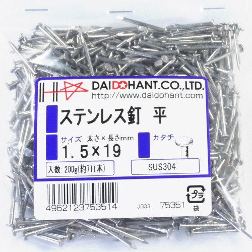 ステンレス釘 平 1.5x19 200g約711本 (VP) 75351 SUS304