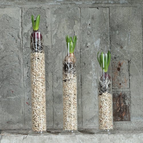 理科室や実験室ではお馴染みの、メスシリンダーをモチーフとしたガラスベース。高さのあるベースなので、茎の長い形状の植物がよく似合います。また、大粒の砂や珊瑚石と、球根のコーディネートも◎。上下に成長する神秘的な様子を楽しむ事が出来ます。選べる3種類の高さも嬉しいポイント。