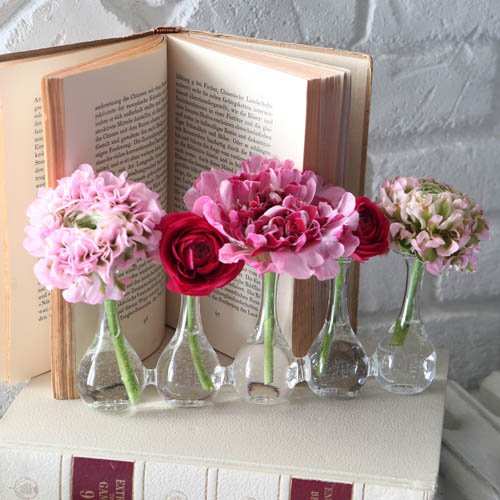 球根の様な曲線が美しく愛らしいミニサイズのガラスベースが、まるで行進している様に連なった連結ベース。一つ一つは一輪挿し程度のサイズなので、全てにお花を生ければお花達のパレードが出来上がります。日常を彩るも良し。特別な日を演出するも良し。整列行進とデコボコ行進の2種類です。