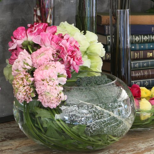 無色透明のガラスベース。ボール状の大きな空間はひとつの世界を形成し、ひとの視線を吸い込む強い力があります。存在感抜群のサイズ感でありながら圧迫感は無く、ショップのディスプレイやインテリアに最適。ご自宅では、特別なおもてなしのインテリアとしてお披露目したいですね。
