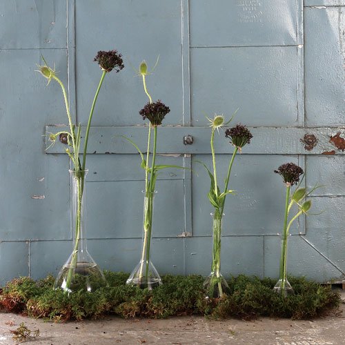 メスフラスコをモチーフにした、ガラスベース。首が長いので、茎がすっと長いタイプのお花が良くマッチします。どことなく、茎が水を吸い上げている様を想像しながら眺めてしまう、不思議なベースです。他のサイエンスインテリアとコーディネートすれば、まるで研究室の様な空間が広がります。