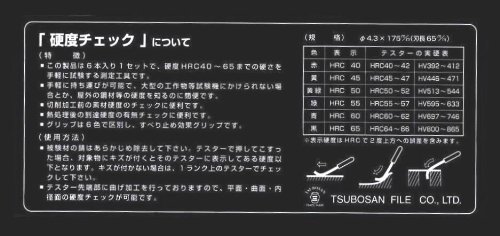 ・HRC55の硬さを手軽に試験できる測定工具です。 ・ポケットに入れて、大型の工作物とか、屋外の特殊鋼材等試験機にかけられない場合に簡便です。 ・切削加工前の被削材の硬度をチェックするとき、熱処理後の到達硬度の有無をチェックするときなど、身近にお役にたちます。