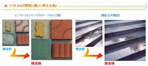 アクトル[白華除去剤]の特徴 【白華であれば中和反応をし、必ず除去出来ます。】 セメント二次製品等から発生する堅くて解けにくい頑固な白いアク、白華現象(エフロレッセンス)が、簡単に、そして確実に水と二酸化炭素に分解除去出来ます。 アクトルの効果 コンクリートやセメント二次製品の白華除去の洗浄力に優れた効果を発揮します。 アクトルは環境に優しい無公害成分を使用しているため、洗浄水はそのまま河川等に流せます。 白華(=エフロ)なら間違いなく取れます。 アクトルの用途とご使用方法 【洗浄体】インターロッキングブロック・ブロック類・コンクリート・モルタル・煉瓦・目地・タイル・テラゾー・ボンタイル・リシン・洋瓦・御影石・ガラス・ステンレス・アルミ・銅・その他セメント二次製品 【汚れ除去】白華・コンパネアク・水垢・洗い出し・錆・湯石・青コケ・黒カビ・大気汚染・その他工事施工仕上げ洗い 【使用方法】アクトルを洗車ブラシ等で汚れ箇所に塗布し、2~3分間放置後に水で洗い流す。アクトルご使用後にアクアブロックコートをご使用いただくことで、表面をコーティングし、その後の白華(エフロ)を抑えることができますのでご一緒でのご購入をおすすめいたします。
