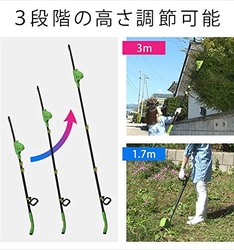 - 軽量設計のコードレス伸縮植木バリカンです。約2.5kgと軽量なので、女性や年配の方でも簡単に扱えます。
