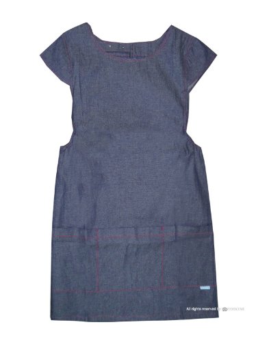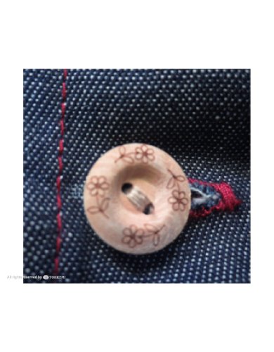 - 特徴: 綿100%(撥水加工)、カジュアルな配色ステッチ、背ボタン留め着脱(調節機能付)、大容量5ポケット、オリジナル花柄ボタン、袖付、ブランドネーム付