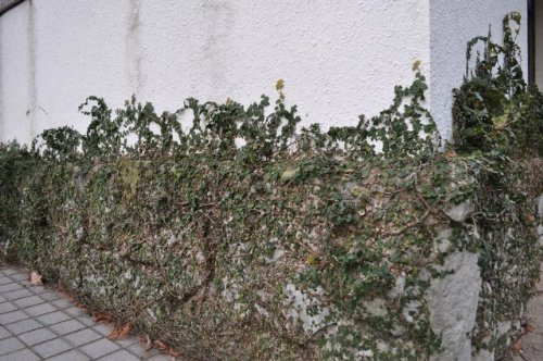 オオイタビは非常に登はん性が強い品種です。無加工の壁にも容易に吸着します。下垂の場合も吸着して頑固なカバーを作れます。安易に壁面緑化をできます。剪定を行ったほうが綺麗に維持できるでしょう。