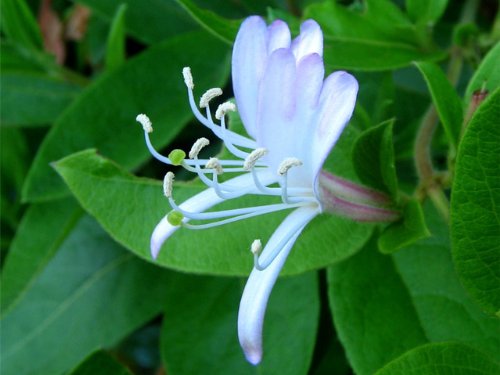 スイカズラは花が美しい品種です。花は蜜を吸えます。防音壁などに這わせて利用されます。