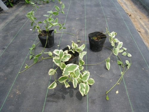 バリエガタは匍匐性の品種です。青々とした葉の色は綺麗です。花は一斉にではなくポツポツと咲きます。
