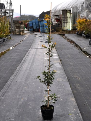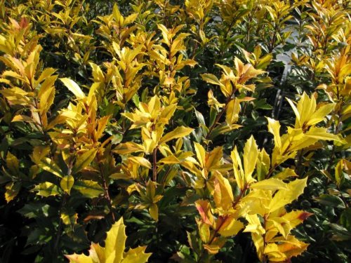 サニーフォスターは黄金色が美しい西洋ヒイラギです。春の新芽が黄色くなり、夏は緑になり、秋から冬にかけてまた黄色になります。葉には小さなトゲがあります。萌芽力が強く刈り込みにも耐えますので生垣に使用できます。