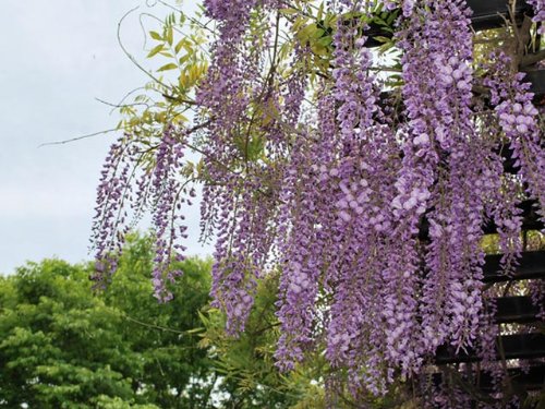 フジは紫色の垂れる花が美しい品種です。公園に日蔭用に這わせてあります。人気がある品種です。