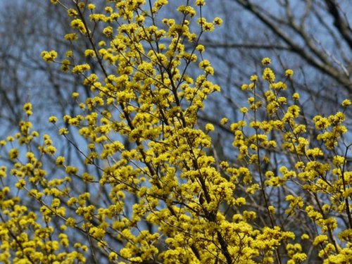 サンシュユは早春に黄色の花が咲きます。秋にはグミのような実がなります。 サンシュとも呼ばれます。