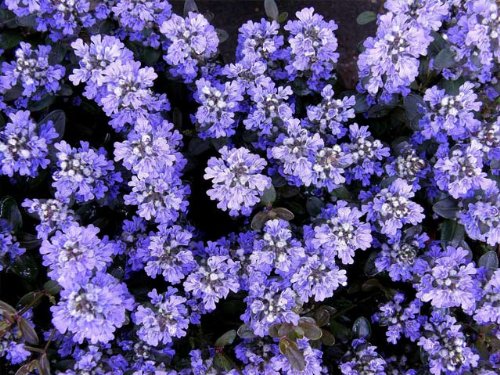 アジュガは0.5m程度になる常緑多年草です。春に咲く青紫色の花や、赤紫色の新芽が特徴です。光沢のある常緑の葉がカーペット状に密集します。繁殖力が旺盛で、ライナーで繁殖します。張って広がる性質から地被としてよく利用できます。半日陰を好みますので、建物の影のような場所にも利用されます。