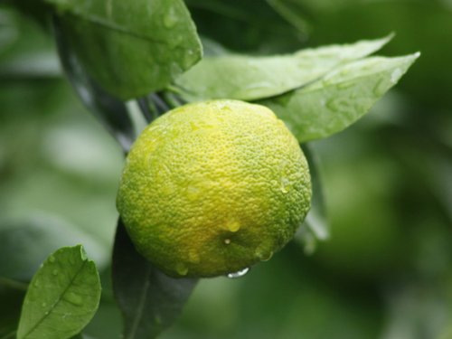 ユズは4mになる常緑高木です。原産は中国が原産です。葉は互生し長卵形で、柄には翼があります。花は白色で5枚弁の花が咲きます。枝には鋭い棘があります。ミカン属の中では寒さに強いため東北地方でも広く栽培されています。果皮は香りがよく、調味料として用いられます。病気の耐性が強く、他の柑橘類に比べ無農薬栽培が簡単にできます。花言葉は「健康美」です。日本が生産・消費ともに世界最大です。
