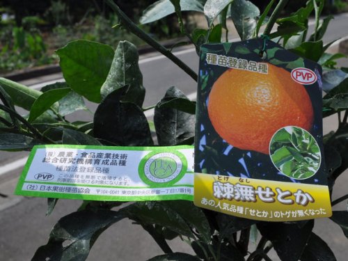 オレンジ/せとかトゲナシは清見にアンコールとマーコット掛け合わせた交配種です。トゲ無しの品種になりますが若木の間はトゲが出ます。果皮は薄く果実は香りがよく多汁でとても甘いです。
