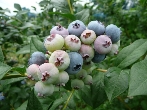 ブルーベリーは、果実が有名で食用をはじめ色々なサプリメントや食品に使われています。実は夏に黄緑色から赤、青紫色・藍黒色へ変化します。葉は明るい黄緑色で秋に美しく紅葉します。花は筒状の鐘形でスズランのような淡桃色です。日本では主に、暖地系のラビット系と寒冷地のハイブッシュ系の2系統が栽培されています。ハイブッシュ系が6~7月にラビット系が8月に実がなります。品種改良が行われ多くの品種があります。