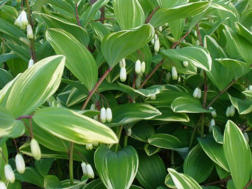 斑入りアマドコロは白斑が美しい品種です。冬には地上部が枯れるため冬に葉がでているヒガンバナなどと組み合わせるとよいです。
