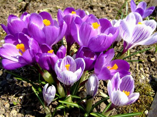 クロッカスは地表すれすれに咲く花がきれいです。葉は来年の為に枯れるまで残しておきましょう。