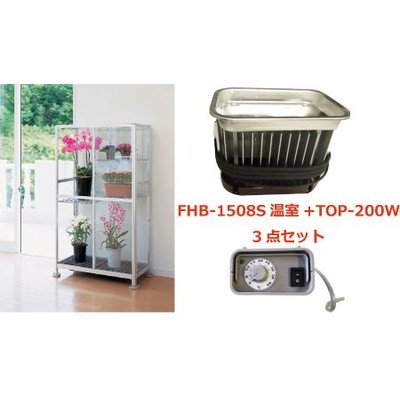 ・園芸温室の用品が揃うセットです。・セット内容・FHB-1508S温室・TOP-200W・アクセラサーモ700【FHB-1508S温室】室内はもちろん玄関やキッチン、廊下などのインドア・リビング専用の温室です。【TOP-200W】お花の冬用ヒーターです。加湿機能付き【アクセラサーモ700】プレートヒーターなど、温度調節の必要な機器の作動温度をコントロールします。【FHB-1508S温室】 ・幅85.2×奥行43.5×高さ150(cm) ・設置寸法/幅91×奥行49×高さ 150(cm) ・アルミ製アルマイト仕上 ・棚板6枚 ・5キロ/一棚当り ・防滴コンセントカバー×2個、コンセントキャップ×2個付 ・組込みコンセント×2 口装備 ・総消費/1200Wまで ・総梱包数/2コ 注意※表示色はモニター等の環境により、実際の色とは異なることがあります。