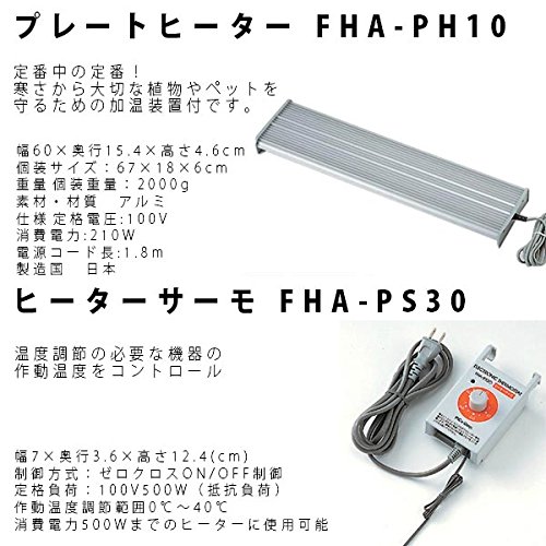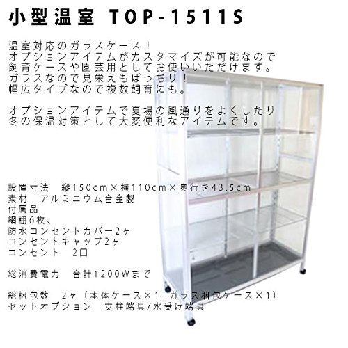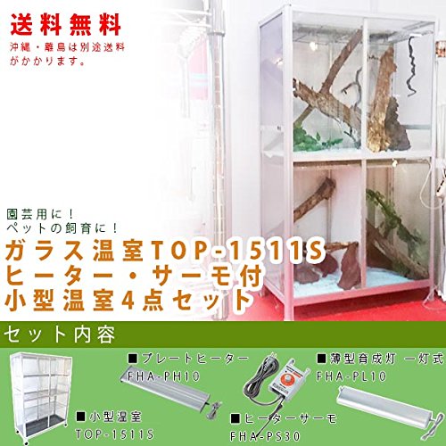 商品詳細 ガラス温室セット セット販売。 温室対応で爬虫類や昆虫、小動物の飼育、園芸にもおすすめ。 フレームはアルミ製アルマイト仕上げのため、お手入れも楽々。 ガラスは安全性を重視して半強化ガラスを使用。 コンセントが2口ついているので、温室に必要なヒーターや換気扇等を設置するのに便利です。 プレートヒーターと電子温度調節器(換気扇サーモ)FHA-PS30、照明(薄型育成灯 FHA-PL10)の 4点セット 商品仕様 【ガラス温室TOP-1511S】 設置寸法 縦150cm×横110cm×奥行き43.5cm 素材 アルミニウム合金製 付属品 網棚6枚、防水コンセントカバー2ヶ、コンセントキャップ2ヶ コンセント 2口 総消費電力 合計1200Wまで 総梱包数 2ヶ(本体ケース×1+ガラス梱包ケース×1) セットオプション 支柱端具/水受け端具 【ヒーターサーモ FHA-PS30】 幅7×奥行3.6×高さ12.4(cm)制御方式:ゼロクロスON/OFF制御定格負荷:100V500W(抵抗負荷)作動温度調節範囲0℃~40℃消費電力500Wまでのヒーターに使用できます。 【プレートヒーター FHA-PH10】 幅60×奥行15.4×高さ4.6cm消費電力:210W ※過剰な暖房による植物の高温障害を防ぐために必ず電子温度調節器(換気扇サーモ)FHA-PS30もしくはFHA-PW10と併用してお使い下さい。 【薄型一灯式ライト TOP-PL10】 寸法 幅62cm×奥行11.7cm×高さ4.2cm 消費電力 24W 付属 20Wランプ1ヶ メーカー トップクリエイト/ピカコーポレーション