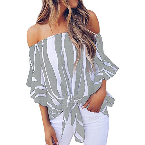 ブラウス レディース トップス Timsa ポロシャツ カジュアル カットソー 夏秋着服 フリル袖 シャツ カットソー ボ オフショルダー Tシャツ ストライプ ベアトップ おしゃれ 上着 レースアップ オフィス ビスチェ 事務 旅行 デート 2018 (L, グレー)