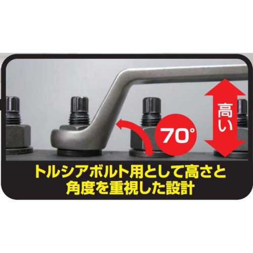 ●トルシアボルトの仮締めや鉄骨の穴合わせに。●トルシアボルト用として高さと角度を重視した設計。●ボルトサイズに合わせ、力の入りやすい長さに設計。●落下防止ケーブルの取付けに困らないように、取付け穴を2ヶ所用意。●防錆効果の高い無電解メッキによる、美しい外観。●パッケージサイズ/縦:375mm横:48mm高さ:75mm●パッケージ重量:660g●二面幅寸法:32mm●全長:375mm●無電解メッキ●落下防止ケーブル用穴付