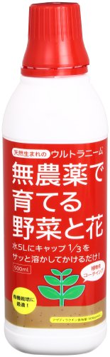 ●【商品説明】●「トヨチュー ウルトラニーム 500ml」は、無農薬栽培の定番アイテム「ニームオイル」を特殊製法で使いやすくした資材です。●水にサッと溶かして植物に散布するだけで、植物をしっかりコーティングします。●【使用方法】●作物名:すべての植物●希釈倍率:100-500倍●使用時期:収穫前日まで●使用方法:葉面散布及び土壌散布週間に1回、500倍に希釈してジョウロや噴霧器で植物全体に与えます。●農薬ではありませんので使用回数の制限もありませんし、収穫直前まで使用できます。●作物にかかっても人体への影響はありません。●※500倍希釈液の作り方:原液量キャップ1杯/水量15L●【ご注意】●使い方を守り、良く振ってお使いください、●飲み物ではありませんので飲まないでください。●目に入った場合はこすらずに水で良く流してください。●万一体に異常を感じた場合は医療機関にて受診してください。●農薬との混用はさけてください。●【品質表示】●肥料の名称:ウルトラニーム●肥料の種類:たい肥●正味重量:500g●原料:ニームエキス、発酵菌・窒素全量0.5%未満...