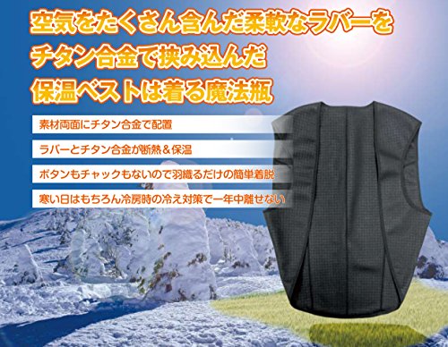 ・ベース素材に断熱性が高い、極薄(0.5mm)の発泡ラバーを使用し、両側をチタン合金層で覆うことで保温性を高めた魔法瓶構造のベストです。