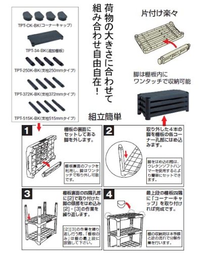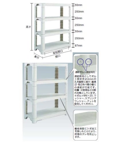 仕様色:ネオグレー間口(mm):850奥行(mm):350高さ(mm):1002棚段数(段):4有効間口(mm):652組立目安:1人20分組立式均等積載量:50kg/段使用温度範囲:-20~60℃最大積載量:200kg/台質量:8.20kg(注意)値が「-」の場合仕様条件に含まれません。【特徴】脚は棚板内にワンタッチで収納可能です。(棚1枚につき脚4本収納可能)脚部には倒れ対策としてボルト固定用の穴を設け、棚長辺・短辺各々隣との連結ができます。プラスチック製のため軽量、また工具不要で組み立ても簡単です。棚板表面にシボ加工をほどこし、荷物のズレを軽減します。【材質/仕上げ】ポリプロピレン(PP)【セット内容/付属品】コーナーキャップ(4個)【注意事項】集中荷重になりますと耐荷重能力は半減します。必ず均等に荷重を分布させてご使用ください。安全のため、組み合わせの際は高さ1800mm以下でご使用ください。均等積載量は、23℃の環境下での設定数値となります。ご利用になる環境の温度によって耐荷重能力が変化します。生産国 日本