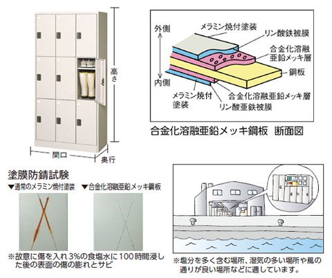 亜鉛メッキに加え、メラミン焼き付け塗装を施しているため、非常に優れた、一般鋼板製品の約2倍の耐食性、耐水性、耐湿性があります。
