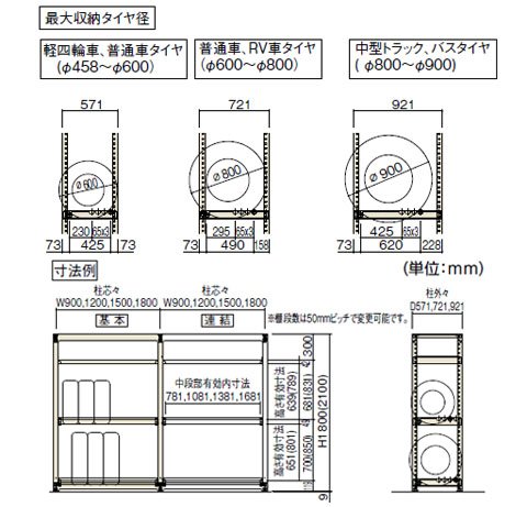 タイヤ受けパイプは65mmピッチ、4段階で取り付け幅を調整可能です。
