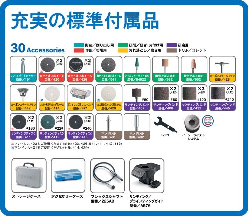 ●イージーツイストシステム搭載、レンチレスでアクセサリーを素早く簡単に交換可能です。●クーリングシステムの改良により冷却効率が従来比20%向上、耐久性が向上しています。●ソフトラバーグリップでペンのように持って使用する際も、手にジャストフィットします。●最大28000回転/分の無段変速でさまざまな材料や用途に対応します。高速回転スピードにより作業は迅速・スムーズです。●彫刻/削り出し●面取り●研削/研ぎ●切断●切削●汚れ落とし/磨き●研磨●穴あけ●無負荷回転数(min[[の-1乗]]):10000~28000●外径(mm):56×50●全長(mm):188●周波数(Hz):60●質量(g):455●電源:100V(50/60Hz)●標準付属コレット径:3.2mm●使用可能コレット径:0.8/1.6/2.4/3.2mm●30種類のアクセサリーが標準装備されています。●カットオフホイール●砥石●サンディングバンド4種類●マンドレル●ハイスピードカッター●サンディングディスクなど●レンチ●ストレージケース●アクセサリーケース●フレッ...