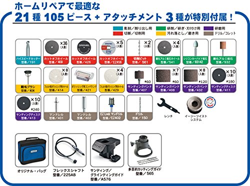 - 付属品:オリジナル・ソフトバッグ、アクセサリー21種・105ピース、アタッチメント3種(フレックスシャフト(225AB)、多目的カッティングキット(565)、サンディング/グラインディングガイド(A576))