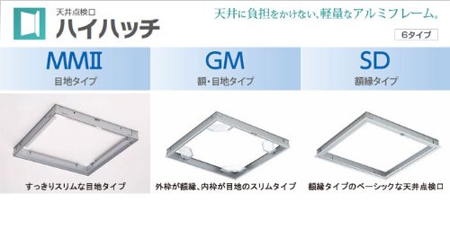 天井に負担をかけない、軽量なアルミフレームを持つ天井点検口です。天井に固定する外枠と扉の役目をする内枠から構成され、その形状で6タイプをラインアップしています。 ハイハッチMM2 (目地タイプ) 枠が細く目立たない、すっきりとした目地タイプの天井点検口です。道具不用で開閉できるスライドロックを採用。枠は標準はアルマイト仕上ですが白目地タイプもあります。(社)公共建築協会の評価品です。 タイプ:目地タイプ寸法:303×303(mm)