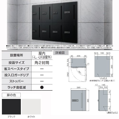 - 注) 可変、静音大型ダイヤル錠は野外防滴仕様ですが防水ではありませんので投入口に郵便物が挟まっていたり、強風雨時には郵便物が濡れる事があります。早めに郵便物を取出すか、軒下等で雨がかりの少ない場所へ設置して下さい。