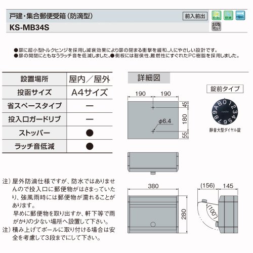 - 注) 野外防滴仕様ですが、防水ではありませんので投入口に郵便物が挟まっていたり、強風雨時には郵便蚋が濡れることがあります。早めに郵便物を取出すか、軒下等で雨がかりの少ない場所へ設置して下さい。