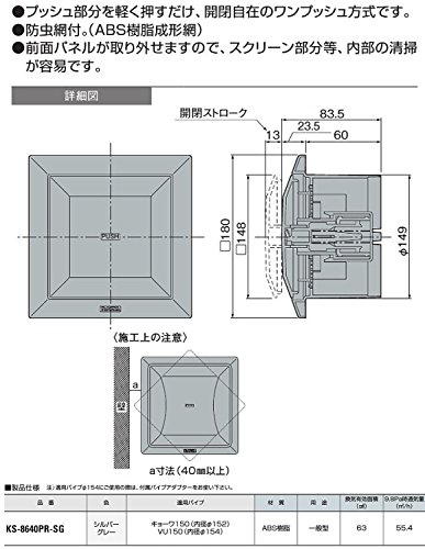 ナスタ 換気部材 プッシュ式レジスター 樹脂製 防虫網付KS-8640PR-SG 150用 色/シルバーグレー 適応パイプ/キューワ150(内径152mm)VU150(内径154mm) 材質/ABS樹脂 ●プッシュ部分を軽く押すだけで、開閉可自在のワンプッシュ方式です。 ●防虫網付。(ABS樹脂成形網)