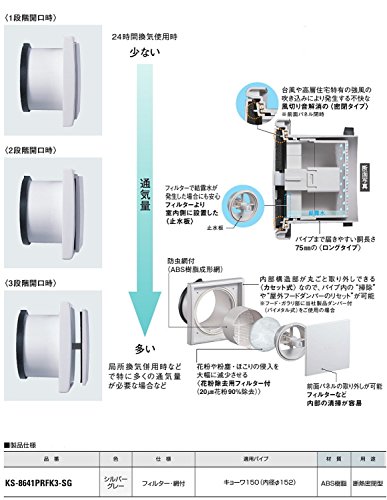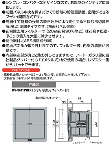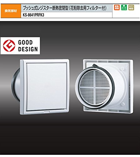 ナスタ 換気部材 プッシュ式レジスター 断熱密閉型 樹脂製 網付・花粉除去フィルター付KS-8641PRFK3-SG 150用 仕様・品番/網付・花粉除去フィルター付KS-8641PRFK3-SG 色/シルバーグレー 適応パイプ/キョーワ150(内径152mm) 材質/ABS樹脂 ●シンプル・コンパクトなデザインなので、お部屋のインテリアに調和します。 ●前面パネル中央を押すだけで3段階の給気量調整・密閉ができるプッシュ開閉式です。 ●高層住宅特有の強風の吹き込みにより発生する不快な風切音を解消した密閉タイプです。(前面パネル閉時) ●花粉除去用フィルター付は花粉や粉塵・ほこりの浸入を大幅に減少させます。 ●防虫網付。(ABS樹脂成形網) ●前面パネルが取り外せますので、フィルター等、内部の清掃が容易です。お手入れ方法花粉除去用フィルターは2~3ヶ月に1度、定期的に水洗いしてください。交換の目安は半年から1年を推奨します。