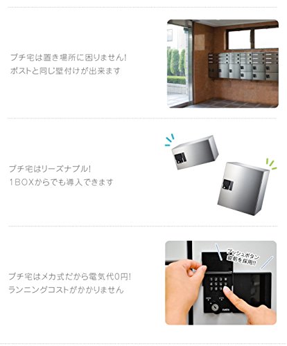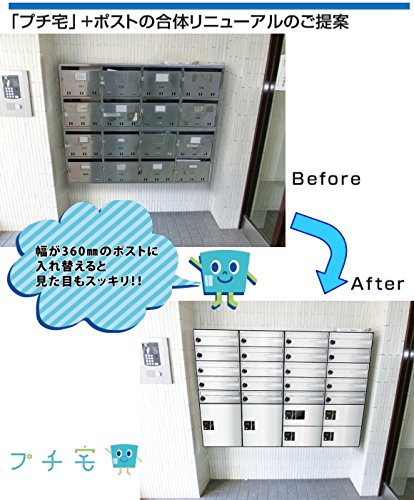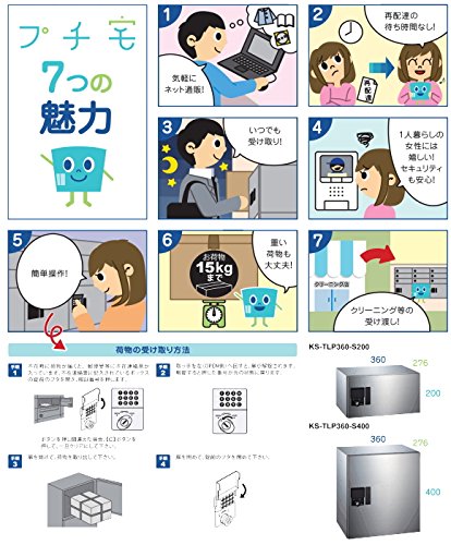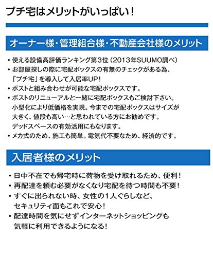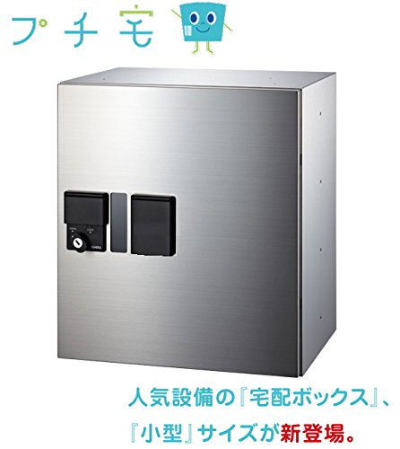 ナスタ 小型宅配ボックス 「プチ宅」 捺印システム付 KS-TLP360B-S400N(前入前出)防滴型。 2Lペットボトル6本入り1箱対応。厚紙のメール便対応。高さ400mmの後付け・壁付タイプ。リフォームにも最適。人気設備の「宅配ボックス」「小型」サイズ(2013年SUUMO調べ) 錠前/プッシュボタン錠 サイズ・質量/H400xW360xD276 6.2kg 仕上げ/本体:NO4仕上 扉:ヘアーライン仕上 アクリル焼付塗装 色:クリア 材質/本体:ステンレス(SUS304)t=0.7mm 扉:ステンレス(SUS304)t=1.0mm ●後付けが出来るためスペースに応じて設置できます。(壁付) ●電気不要のメカ式なのでランニングコスト不要で経済的。 ●屋外仕様です。 ●雨が入りにくい防滴設計です。 ●万が一雨が入ってもスノコ付きで荷物が濡れにくい構造です。 ●防水構造ではありませんので、強風雨や諸条件によっては荷物が濡れることがあります。 早めに荷物を取り出すか、軒下等で雨がかりの少ない場所へ設置してください。 ※ボックス扉数の目安は世帯数の20~30%です。 プチ宅はメリットがいっぱい。 ●オーナー様・管理組合様・不動産会社様のメリット ・使える設備高評価ランキング第3位(2013年SUUMO調べ) ・宅配ボックス有のチェック項目で入居率もUP。 ・後付けのためリフォームに最適。 ・メカ式のため、施行も簡単。電気代不要なため、経済的です。等 ●入居者様のメリット ・日中不在でも帰宅時に荷物を受け取れるため、便利。 ・再配達を頼む必要がなくなり宅配を待つ時間も不要。 ・配達時間を気にせずインターネットショッピングも気軽に利用できます。