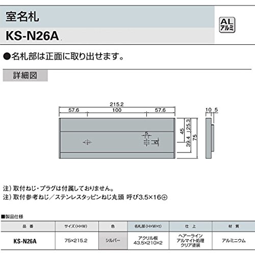 ナスタ 室名札 KS-N26A シルバー 75x215.2 アルミ製。名札部は正面に取り出せます。 サイズ75x215.2(mm) 仕上/ヘアライン アルマイト処理 クリア塗装 材質/アルミニウム 注意/取付ねじ・プラグ・ルームナンバーは付属していません。 取付け参考ネジ/ステンレスタッピングねじ丸頭3.5x16 名札部は正面に取り出せます。