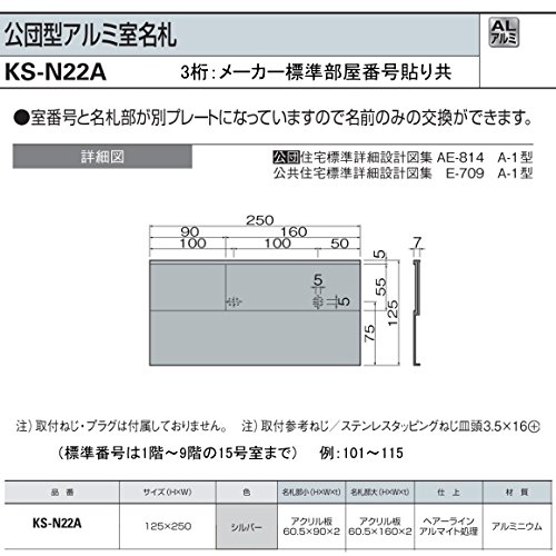ナスタ 公団型アルミ室名札 KS-N22A (部屋番号付き)シルバー125x250。3桁のメーカー標準部屋ナンバー貼り付けて出荷します。 室番号と名札部が別プレートになっていますので名前のみの交換ができます。 サイズ/H125xW250(mm) 標準ナンバー/1階から9階までの15号室まで。例:101~115 材質/本体:アルミニウムヘアラインアルマイト処理 名札部小(HxWxt):アクリル板 60.5x90x2 名札部大(HxWxt):アクリル板 60.5x160x2 3桁の部屋ナンバーは、備考にご記入ください。 納期は部屋ナンバー確認後、1週間前後必要です。 取付ねじ・プラグは付属していません。 取付け参考ネジ/ステンレスタッピングねじ皿頭3.5x16 ●公団型アルミ室名札 ●室番号と名札部が別プレートになっていますので名前のみの交換ができます。