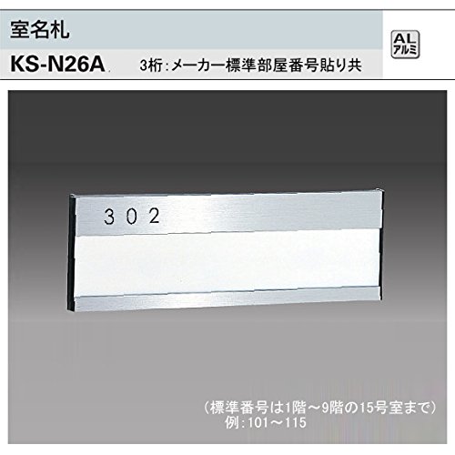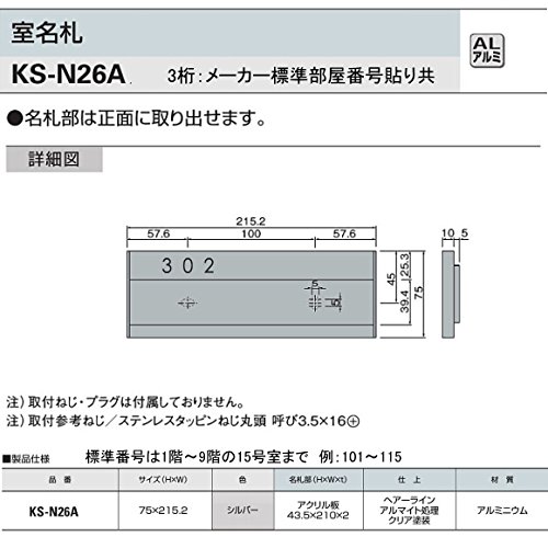 ナスタ 室名札 KS-N26A (部屋番号付き)シルバー 75x215.2 アルミ製。4桁の特注番号(例:A101、1016,1516,9999,など)をメーカーで貼り付けて出荷します。 名札部は正面に取り出せます。 サイズ/75x215.2(mm) /ヘアライン・アルマイト処理・クリア塗装 材質/アルミニウム 4桁の部屋ナンバーは、備考にご記入ください。 納期は部屋ナンバー確認後、1週間前後必要です。 取付ねじ・プラグ・ルームナンバーは付属していません。 取付け参考ネジ/ステンレスタッピングねじ丸頭3.5x16特徴名札部は正面に取り出せます。