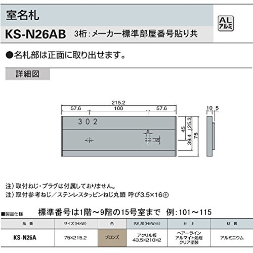 ナスタ 室名札 KS-N26AB (部屋番号付き)ブロンズ 75x215.2 アルミ製。3桁のメーカー標準部屋ナンバー貼り付けて出荷します。名札部は正面に取り出せます。 サイズ/75x215.2(mm) 標準ナンバー/1階から9階までの15号室まで。例:101~115 仕上/ヘアライン・アルマイト処理・クリア塗装 材質/アルミニウム 3桁の部屋ナンバーは、備考にご記入ください。 納期は部屋ナンバー確認後、1週間前後必要です。 取付ねじ・プラグ・ルームナンバーは付属していません。 取付け参考ネジ/ステンレスタッピングねじ丸頭3.5x16特徴名札部は正面に取り出せます。