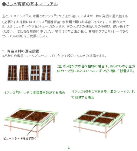 作物の育苗にそのまま使用できる人工成形培地! フェノール樹脂の発泡体で連続気孔構造をして おり、吸水性、通気性に富んでいます。 空気と水分のバランスがよいため、カルス形成 や発芽、発根が容易です。 無菌加工がしてあるのでクリーン栽培ができます。 軽量で使いやすく、作業性がすぐれています。 土壌に培地ごと移植することができます。 仕様 シートサイズ タテ245×ヨコ508×厚さ38mm コマのサイズ 約(タテ20.4×ヨコ22.1×厚さ38.0mm) シート数 20枚 1シートあたりのコマ数 276コマ 形状 切り目入り立方体 色 灰褐色 構造 高密度連続気孔体 pH 6~7 灌水時の三相分布 気相 約35% 水分相 約63% 固形物 約2% 加工 無菌加工 肥料添加 N:P:K=1:1:1(約10日分)
