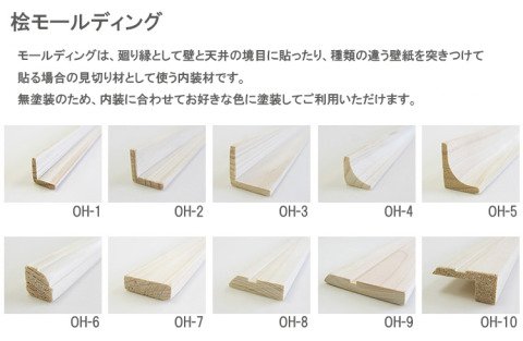 桧モールディングは、廻り縁として壁と天井の境目に貼ったり、種類の違う壁紙を突きつけて貼る場合の、見切り材として使う内装材です。装飾的でボリュームのあるものや、シンプルなものまで、お部屋に合わせてデザイン・サイズをお選びください。節はできる限り省いておりますが、裏面に若干、小節が入ることもございます。