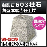 束石・塚石 603柱石角型(貫通穴タイプ)本磨き仕上げWI-50 天端5寸 ホゾ穴50×50×40mm 寸法(天×底×高)150×205×195mm 貫通穴は直径20です。適応コーチボルトはBT-270です。