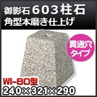 束石・塚石 603柱石角型(貫通穴タイプ)本磨き仕上げWI-80 天端8寸 ホゾ穴50×50×40mm 寸法(天×底×高)240×321×290mm 貫通穴は直径20です。適応コーチボルトはBT-360です。