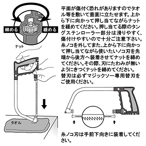 木材から合板(集成材)、竹、軟鉄、アルミ、塩ビ、プラスチックなどが切れる多目的のこぎりです。糸のこ刃は強度としなやかさを兼ね備えた特殊ブレードです。折れにくく曲線切りがラクラクできます。替刃は回すだけで簡単に取付可能です。別売りの平のこ刃、ダイヤモンド刃、ダイヤモンドシャープナー刃も取り付け可能です。平のこ刃を取り付ければベニヤ板等の薄い素材、ダイヤモンド刃はガラス、タイルなどが切れ用途がさらに広がります。用途:木材、合板(集成材)、竹、軟鉄、アルミ、塩ビ、プラスチック等の切断